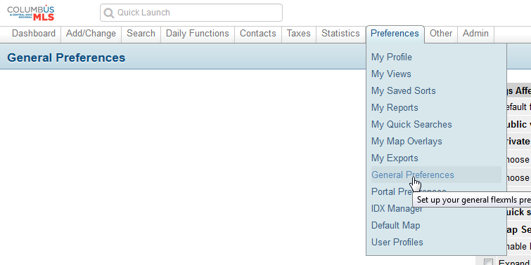 Listing Report Issue UPDATE: As of 2:28PM it appears our vendor may have made progress on this issue. Currently there is an issue with the default listing report within Flexmls. The MLS software company (FBS) is currently aware of the situation and are working towards a resolution. You can use the “Report” button above the listing report when on the Detail screen to temporarily bring up the “CR Full Report”. You can also permanently select the default listing report that is displayed within your Flexmls preferences. The instructions below are how to do that: 1. Hover your mouse over “Preferences”, and click “General Preferences” from the drop down menu.2. Locate the “Choose a default listing report” setting. Click the drop down menu next to it, and select the option of: “CR Full Report” from the drop down menu.