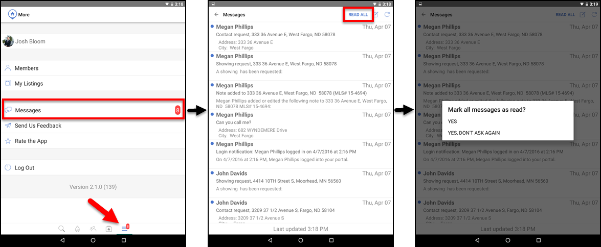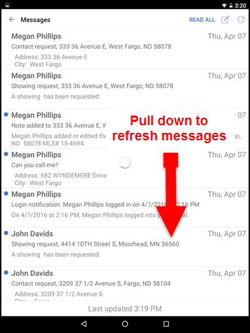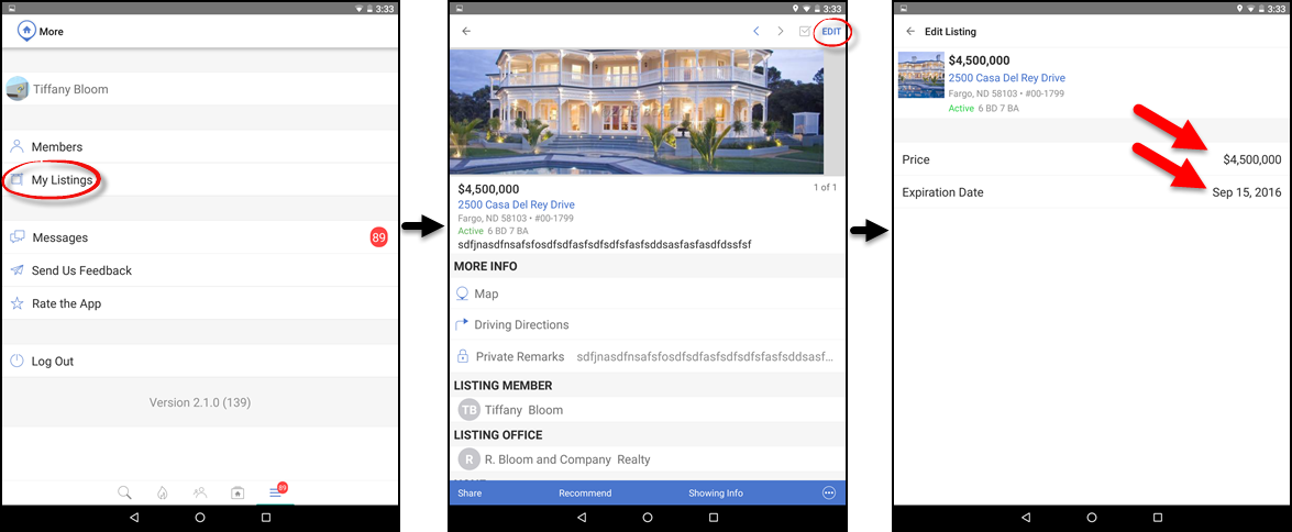 Flexmls Pro: New Android Version 2.1.0 – April 25 On April 25, Flexmls Pro version 2.1.0 for Android will be released and available in the Google Play Store. The latest version will include the ability to mark all messages as having been read, the ability to change the price and expiration date for your listings, clickable phone numbers, and more. Mark All Messages as Read If you select YES, all of your current messages will be marked as having been read. The next time you tap READ ALL when checking your messages, you will receive the same confirmation dialogue box. If you select YES, DON’T ASK AGAIN, all of your current messages will be marked as having been read, and the next time you tap READ ALL when checking your messages, you will not receive a confirmation dialogue. Instead, all messages will automatically be marked as read. To cancel, tap the screen anywhere outside of the confirmation dialogue box. To refresh your messages, tap the screen and pull down. Listing Maintenance: Price Change and Expiration Date Interactive Phone Numbers on Detail Screen Other Changes