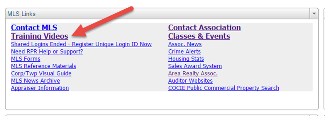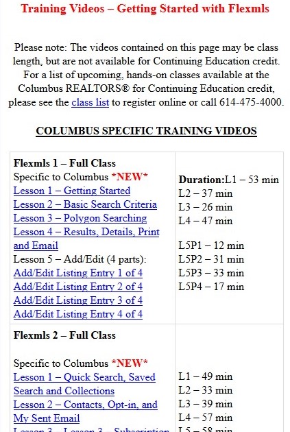Flexmls Columbus-Specific Training Videos – Learn to Use the MLS from Home Flexmls Full Class Training Videos are Available Online The Flexmls 1 and Flexmls 2 Class videos contain the same material covered in the full 6 hours of hands-on MLS classes. It will closely mirror the class instruction offered in house. All videos labeled “Specific to Columbus” are recorded on the Columbus MLS. They will use the same fields and screens you will see when logged into the MLS, not fields and screens from Tulsa, Fargo, or Florida. You can watch these MLS training videos from the comfort of your home. Single videos on multiple Add/Edit features, Hotsheet Basics, Saved Searches, CMAs, Contact Management are also available. Whether you want to get up to speed on everything Flexmls has to offer, or just want a refresher on one topic, we have you covered. Please note: While the full class videos cover the same material in the Flexmls 1 & 2 classes, the video classes DO NOT QUALIFY for CE credit. They are informational only. Here’s how to find the Training Videos: 1. Log in to MLS 2. Click on ‘Training Videos’ as shown here: