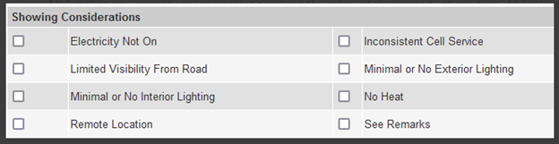 New Field: Showing Considerations – Coming October 24 A new field, “Showing Considerations”, will be added to MLS on October 24th. The field is a RESO field originally labeled “Safety Concerns”. The field name was changed to allow for additional items that should be “considered” prior to showings. The intent is the same: to inform agents prior to showing a property. Showing Considerations field options: