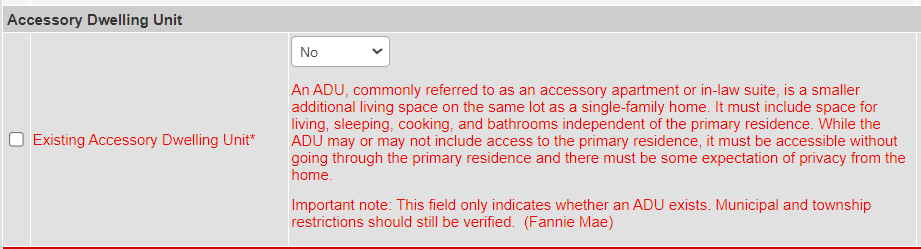 New MLS Field: Existing Accessory Dwelling Unit A new field has been added to the Residential add/edit screen. ![]() Summary of the new “Existing Accessory Dwelling Unit” field: