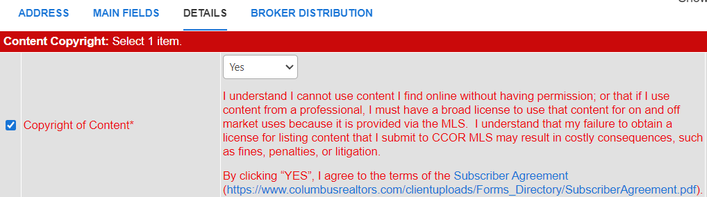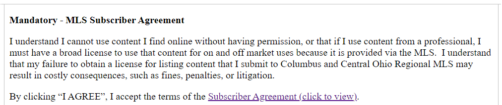 New Field in MLS: Copyright of Content – June 3 Monday, June 3, a new, required “Copyright of Content” field has been added to MLS. The field requires that the agent select “Yes” to agree to the new mandatory MLS Subscriber agreement for each listing. ![]() By checking the box and accepting this subscriber agreement, the MLS will be protected should it be later proved that the participating agent does not have the authority to upload data. Additionally, this agreement protects the Columbus & Central Ohio Regional MLS against copyright infringement or violation of Fair Housing Laws. This indemnification agreement was developed and approved by the association’s MLS Task Force and MLS Board of Directors in conjunction with legal counsel. Notices are being sent to all MLS participants today (May 29) and again on June 2 in preparation for the opt-in alert on June 3 in FlexMLS. Any questions about this agreement can be forwarded to Todd Laber, Senior Director of Technology, Columbus REALTORS®.